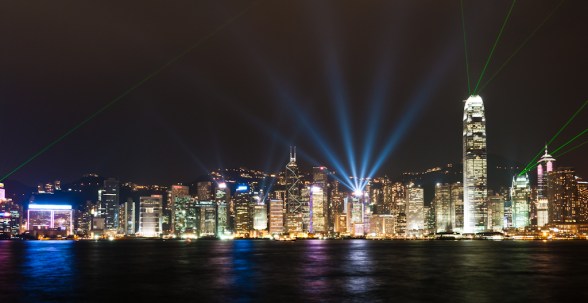 Immer wieder ein optischer Leckerbissen: Die Lasershow „Symphony of Lights“ in Hongkong. Seit ich dort gelebt habe, sind mir die Buildings sehr vertraut und deswegen mag ich den Beginn der Show besonders gern, denn dann werden die mitwirkenden Tower vorgestellt und machen durch ein Lichtsignal auf sich aufmerksam. Hier strahlt es gerade intensiv vom Dach des HSBC-Main-Buildings, rechts daneben der IFC-Two, derzeit das höchste Gebäude auf Hongkong Island.