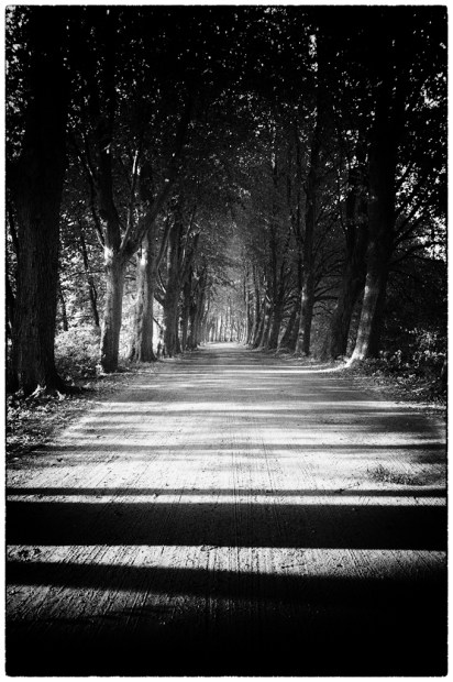 Die Geschichte beginnt natürlich viel früher. Vorgestern war gutes Wetter und ich hatte Lust auf eine kleine Radtour und habe die Kamera mitgenommen. Die Tour führte mich durch Felder und Wiesen, vorbei an einem kleinen See, an Pferdekoppeln und recht idyllischen Plätzen. Manchmal nahm ich fast schon pflichtbewusst meine Kamera, um ein Foto zu machen, aber das Gefühl für die Aufnahme stellte sich nicht ein. Und dann war das Bild plötzlich da….. Eine kleine Allee und ich sah dieses Bild bereits in schwarzweiß konvertiert und mit einem schönen Effekt bearbeitet. Das ist der Moment, in dem ich meine Umgebung komplett ausblende, was in diesem Fall etwas brenzlig war, denn ich nahm auch das Auto nicht wahr, welches sich von hinten näherte. Der Autofahrer hatte offenbar Verständnis und hielt an, so dass ich in Ruhe dieses Bild machen konnte. Ich sah ihn erst, als ich fertig war und mich wieder aufrichtete. Ein entschuldigendes Lächeln meinerseits traf auf ein verständnisvolles Lächeln seinerseits und dann sah ich nur noch Staub 😉