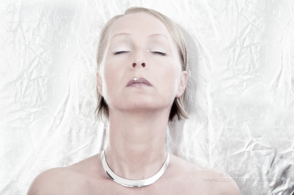 Oft schießen einem Ideen in den Kopf und kein Mensch ist greifbar, mit dem man sie umsetzen könnte. So ist dieses Bild entstanden. Ich brauchte „Rohmaterial“ um mich durch ein Video-Tutorial i. S. professionelle Portrait-Retusche in Photoshop zu kämpfen und hatte die Idee zu diesem Bild. Tricky ist natürlich immer die Sache mit dem Fokus, wenn man sich selbst fotografiert. Da ich hier die Schärfe auf den Augen haben wollte, habe ich eine Leiter aufgestellt und auf das Ende der oberen Stufe fokussiert,