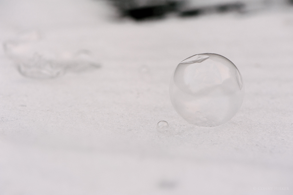 26 Als es so kalt wurde, habe ich mich sofort auf die Socken gemacht, um Seifenblasen zu kaufen. Die sollen nämlich ab -9°C zu kleinen Schönheiten gefrieren. Bei -11°C hat es nicht wirklich funktioniert. Vor allem zerplatzten sie auf nahezu jeder Oberfläche, nur nicht auf dem Schnee. Ich war also sehr beschäftigt damit, überhaupt einige dahin zu retten und dann schnell ein Bild einzufangen, bevor sie wieder verschwanden :-D. Vermutlich wäre Sonne oder eine künstliche Lichtquelle im Hintergrund sehr effektvoll gewesen, aber dafür war leider einfach keine Zeit.