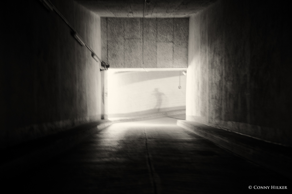 Ich fotografiere gern in den menschenleeren Straßen und mag es, wenn die Lichter oder die Dunkelheit der Nacht das Bild der Stadt prägen. Man gewinnt Einblicke, die bei Tag nicht möglich sind, so entdeckte ich das Treppenhaus mit den den schönen grünen Wandfliesen bei Nacht, bei Tag bin ich daran bisher immer vorbeigelaufen, ohne es zu beachten. Die Ausfahrt eines Parkhauses wird zu einem interessanten Objekt, wenn der Asphalt die Lichter reflektiert. Während ich dort hockte, beschäftigt mit der Ausrichtung der Kamera, tauchte plötzlich dieser Schatten auf und ich habe mich so erschrocken, dass ich die Kamera verriss :-D. Aber genau wegen dieser Geschichte mag ich das Bild so.