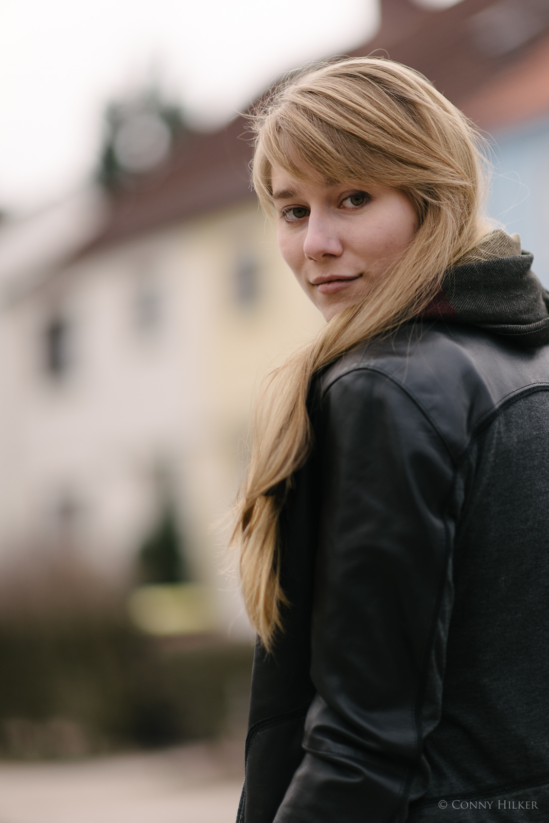 An der Version in Farbe mag ich die Pastelltöne im Hintergrund sehr, die ganz nebenbei und subtil Informationen über den Ort geben und zusammen mit der schönen Haarfarbe besonders wirken. Miriam selbst (auf diesem Foto 😉 ) gefällt mir besser in s/w, allerdings verliert sich hier der Hintergrund und löst sich fast auf.