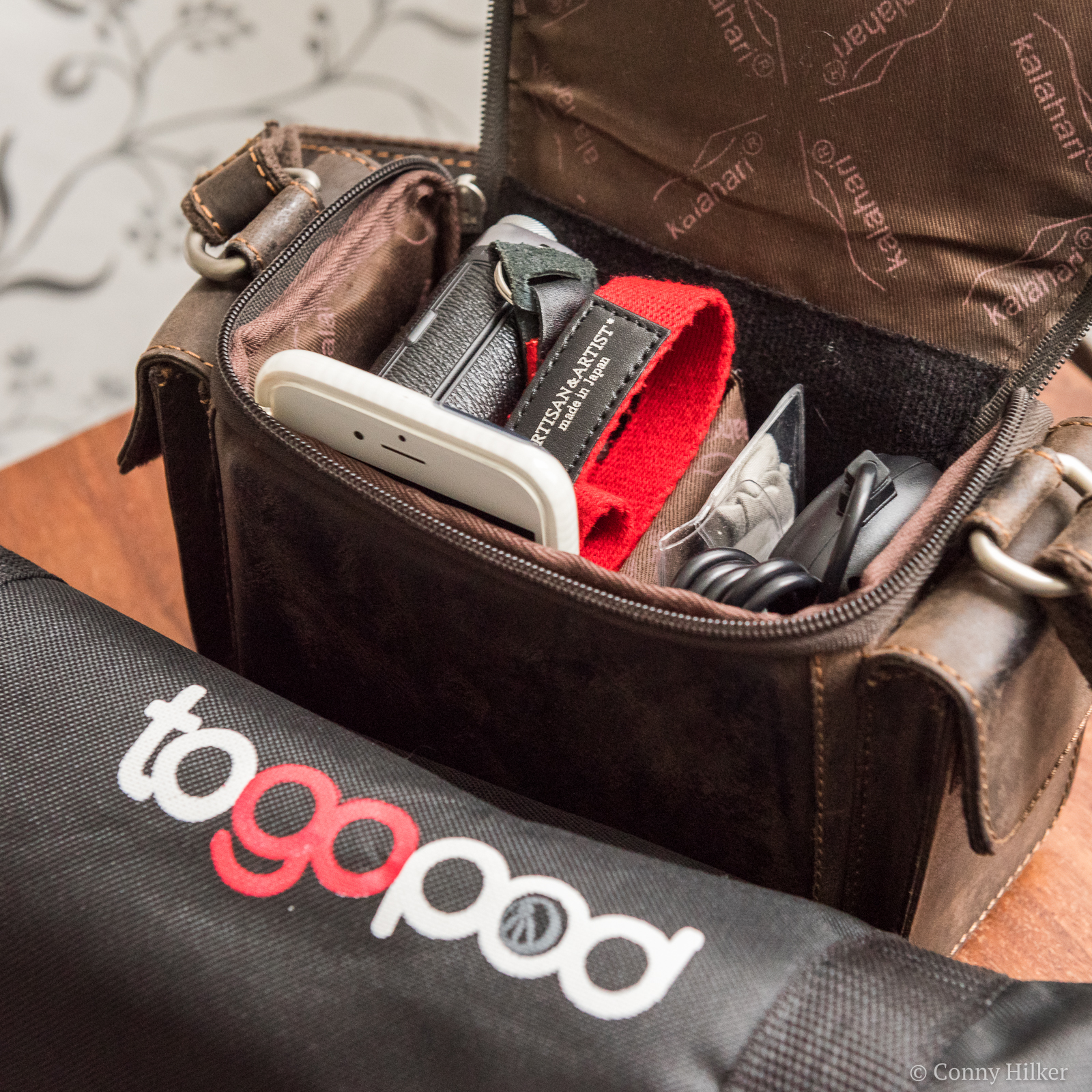 In der Tasche transportierte ich die Kamera mit angesetzter Gegenlichtblende und Klarglasfilter zum Schutz der Linse vor Feuchtigkeit und Salz, mehrere Speicherkarten, Putztuch, ND-Filter (1,8), einen Fernauslöser, Ersatz-Batterien und Akkus. In der Tasche war zum Glück auch noch Platz für´s Telefon und den Lippenstift.