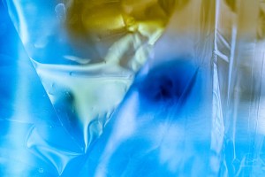 Abstraktes Bild einer zerknüllten Klarsichtfolie vor einer Vase
