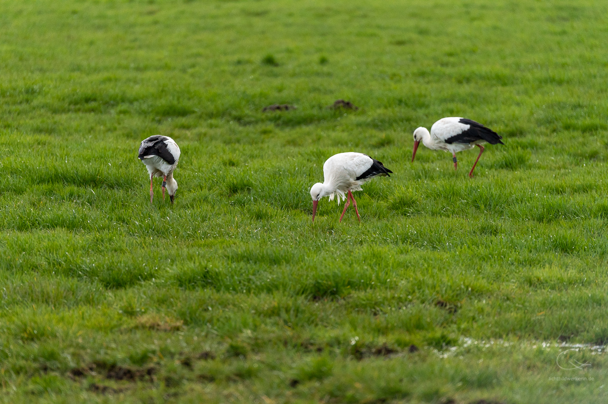 Mich fasziniert, dass die Störche hier immer präsent sind. Egal wo ich spazieren gehe oder fahre, es sind immer Störche in der Nähe. Guckt man hoch, fliegt sicher irgendwo einer und das sieht wirklich majestätisch aus. Auf der Wiese um die Ecke habe ich neulich 14 Stück gesehen. Witzigerweise sind sie zwar Menschen gegenüber recht scheu, fliegen auf, wenn man sich zu Fuß zu nähern versucht. Nicht aber bei den schweren Landwirtschaftsmaschinen. Seelenruhig picken sie weiter in den Wiesen, während der Bauer mit großem Gerät das Heu einfährt.