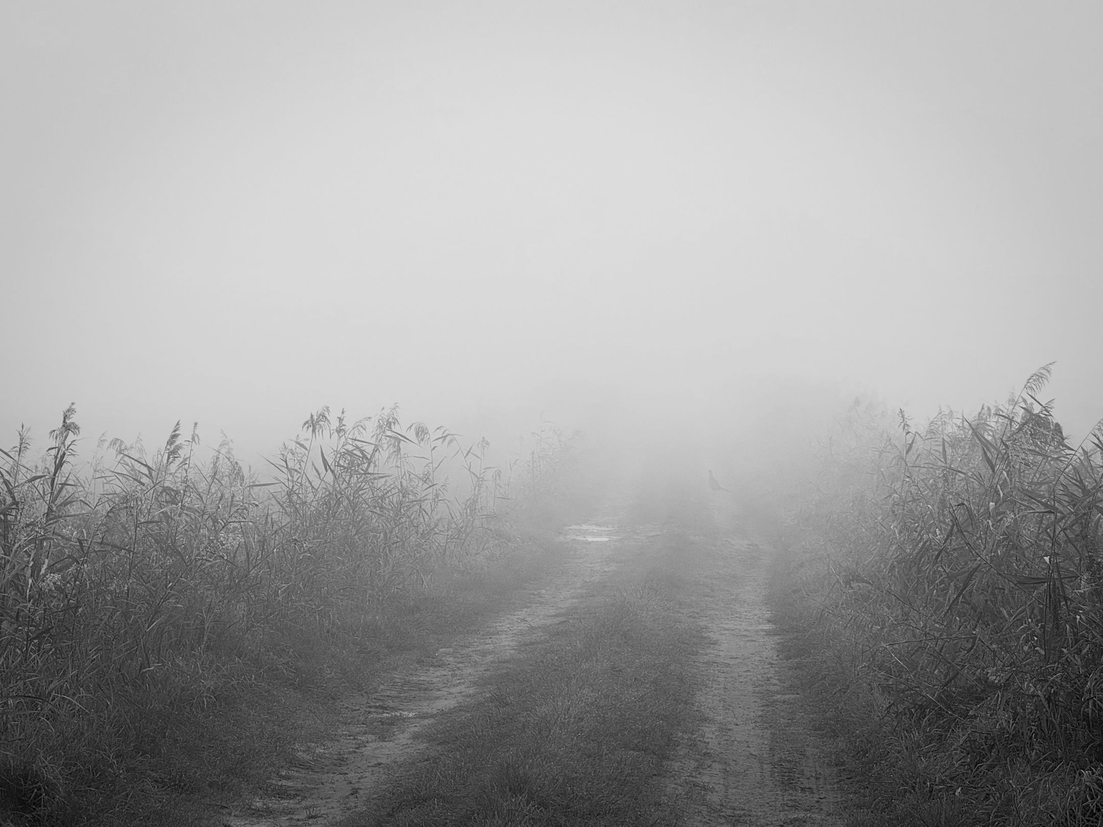 Dann ein Doppelschrei und eine Bewegung im Nebel. Ich drehe mich zur Seite und erwische den Fasan gerade noch im Wegfliegen. Dann kehrt wieder Stille ein. Der Weg führt uns zurück auf den Hügel.