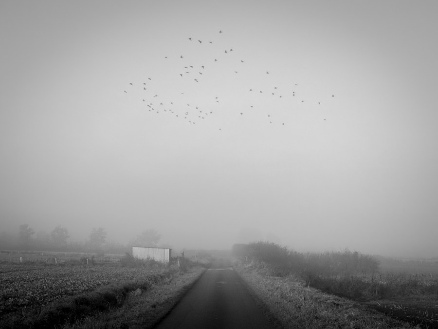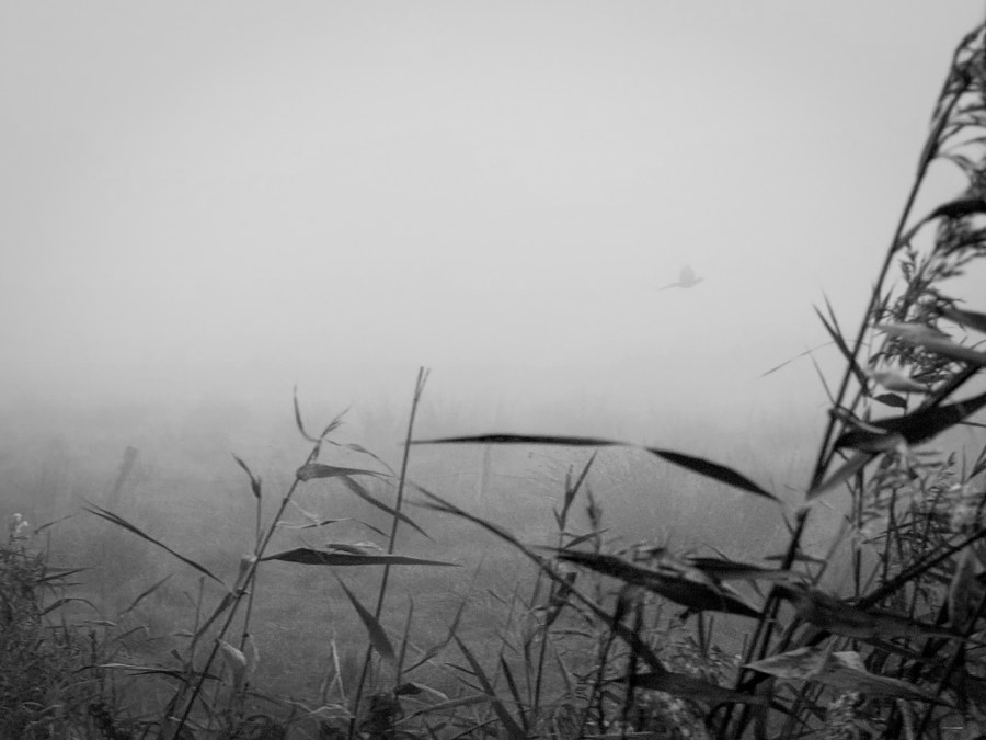 Wir folgen dem bekannten Weg, der runter in das flache Grünland führt. Die Stille hier wird jäh unterbrochen von einem lauten, krächzigen Schrei. Und noch einem. Ich versuche zu identifizieren, was sich da im Nebel versteckt, kann es aber nicht erkennen. Ein schemenhafter, schreiender Schatten.