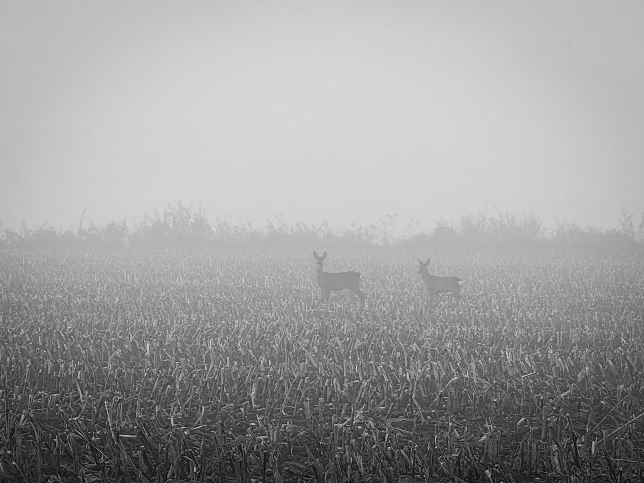 Die schmale Straße ist gesäumt von den typischen dichten Knick-Hecken, hinter denen hier die abgeernteten Maisfelder liegen. Am Ende der Hecke haben wir Sicht aufs Feld und stehen plötzlich zwei Rehen gegenüber, die genauso überrascht sind wie wir. Ich flüstere meiner passionierten Jägerin zu, sie möge still sein und bleiben. Ich glaube, sie spürt meine Spannung und steht tatsächlich still neben mir. Es gelingt mir, ein Foto zu machen, bevor die Rehe flüchten.