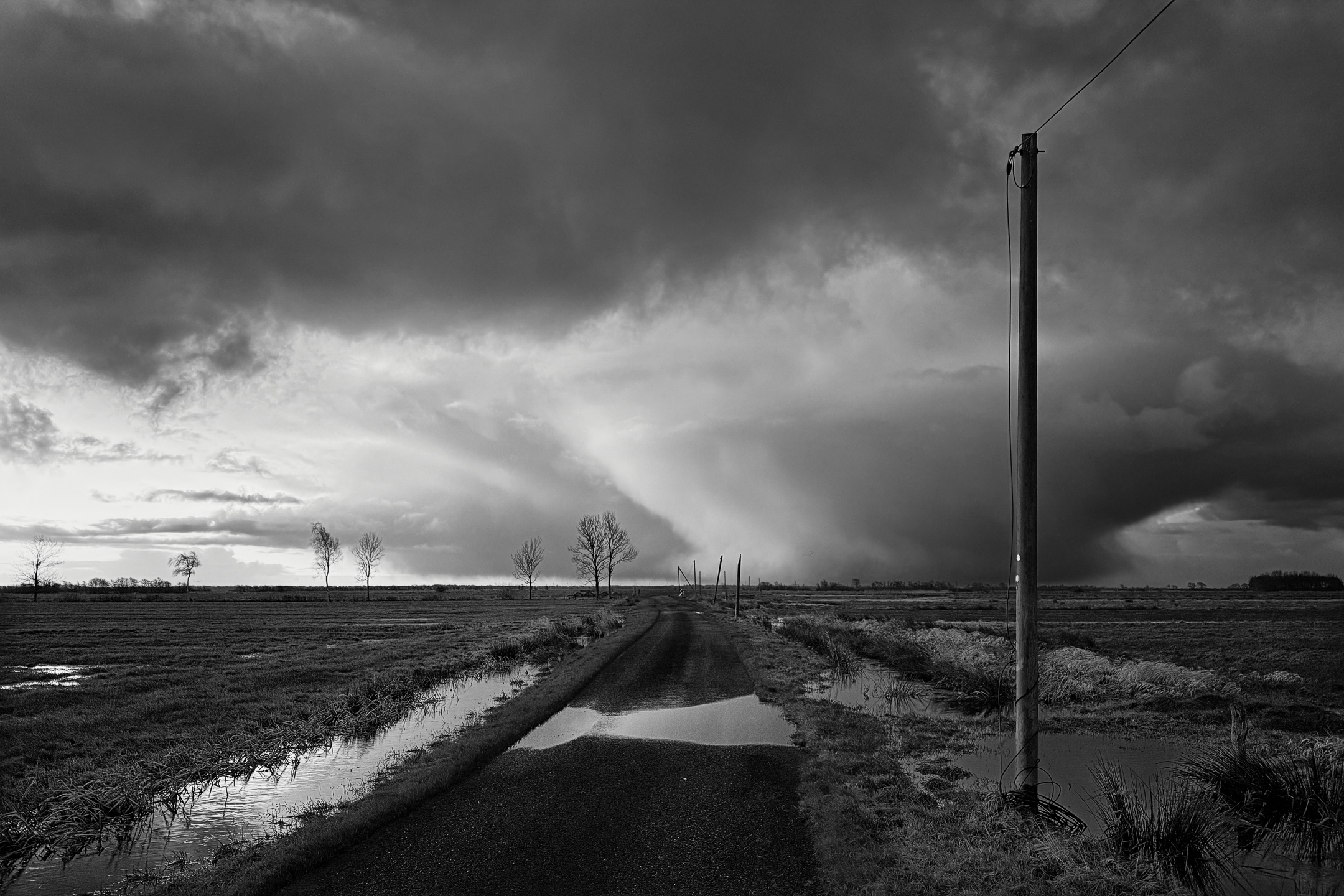Ein trüber, nasser, nebliger Monat. Das platte Land zeigt sich zerzaust, in einem grau/braun/rest-grünen Einerlei. Der Anblick ist an Tristesse nicht zu überbieten. Einzig die kahlen Bäume bieten dem Auge einen Ankerpunkt. Sie offenbaren jetzt ihre wahre und oft imposante Gestalt. Imposant kommt auch das Wolkenspiel daher. Optisch wirkt es manches Mal so, als könne einem hier der Himmel auf den Kopf fallen.