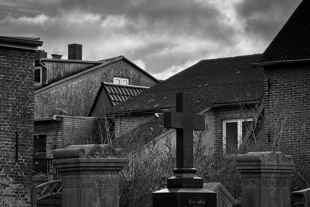 Im Dezember entsteht diese Aufnahme in Friedrichstadt. Gut versteckt hinter einer sehr kleinen Kirche entdecke ich zufällig diesen Mennoniten-Friedhof mit einigen wenigen Gräbern. Ich mag den Blick auf die verschachtelten Dächer.