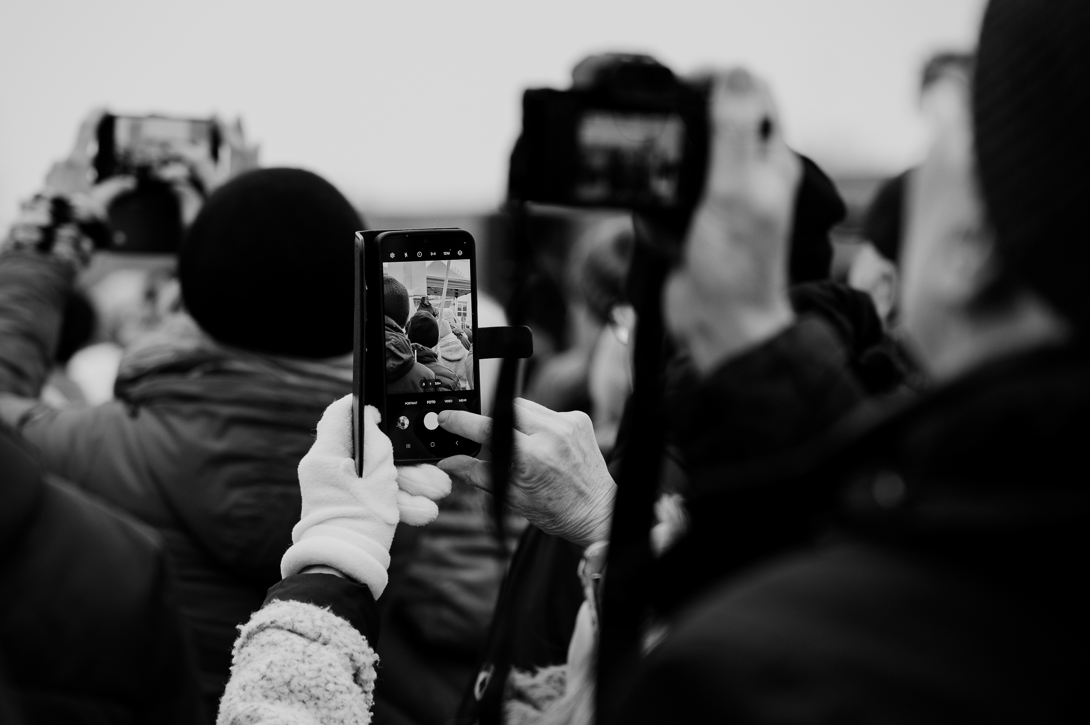 Demo gegen Rechts in Schleswig. Laut und bunt 🌈. Es war irrsinnig kalt an dem Tag, aber alle halten durch. Und ich habe das erste Mal mein neues Objektiv mit. Als der Gitarrist von Santiano, Hans-Timm Hinrichsen, spricht, werden natürlich viele Handys und Kameras gezückt, um diesen Moment festzuhalten. Ich nutze solche Momente gern, um in die Displays anderer zu fokussieren.