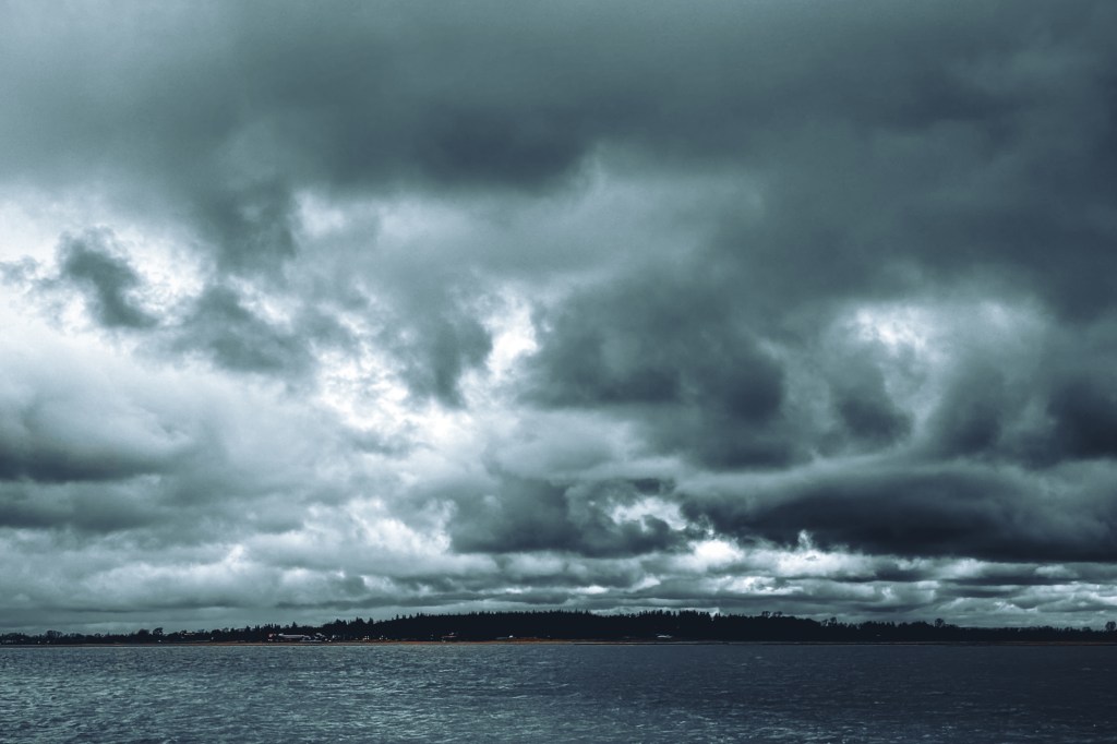 Ab und zu fahre ich zum Spazierengehen mit der Hündin gern in den Husumer Dockkoog, wo zwar nicht immer Wasser ist, dafür aber fast immer tolle Wolkenspiele. An diesem Tag hatte ich Glück, da braute sich richtig was zusammen. Blick auf Nordstrand.